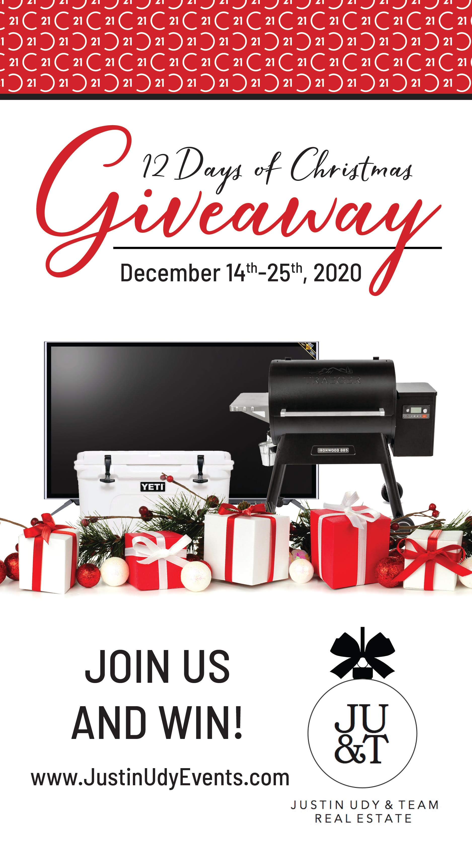With the holiday season in full swing, I want to invite you and your family to participate in our latest client event: The 12 Days of Christmas. This event will run from December 14 through Christmas Day. Each day, we’ll give away a fabulous gift at random to anyone who registers. We have a ton of great items available including a YETI cooler, Traeger grill, big-screen TV, etc.